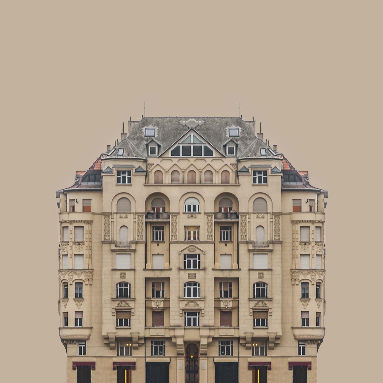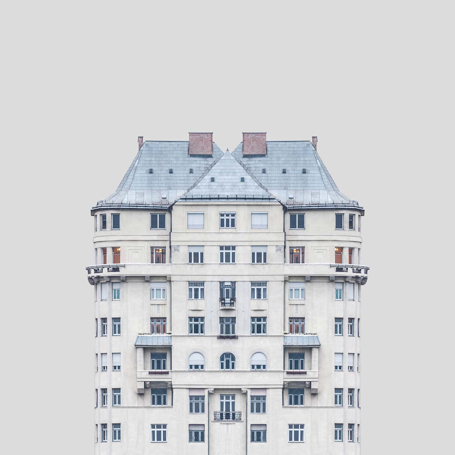 ‘Urban Symmetry’ presenta edificios a orillas del Danubio que se destacan de su entorno y se colocan en un espacio insonorizado, homogéneo y libre de información exterior. Sin embargo, la serie no puede considerarse un estudio seco, ya que no muestra la realidad cruda: si observamos las fotografías con más detenimiento, podemos descubrir que ninguna de las imágenes muestra los edificios en su forma completa, sino solo su parte reflejada. Al fin y al cabo, estos edificios ficticios cobran vida y condensan su carácter original, como si pudiéramos ver rostros humanos y diferentes personalidades en los retratos de los edificios.